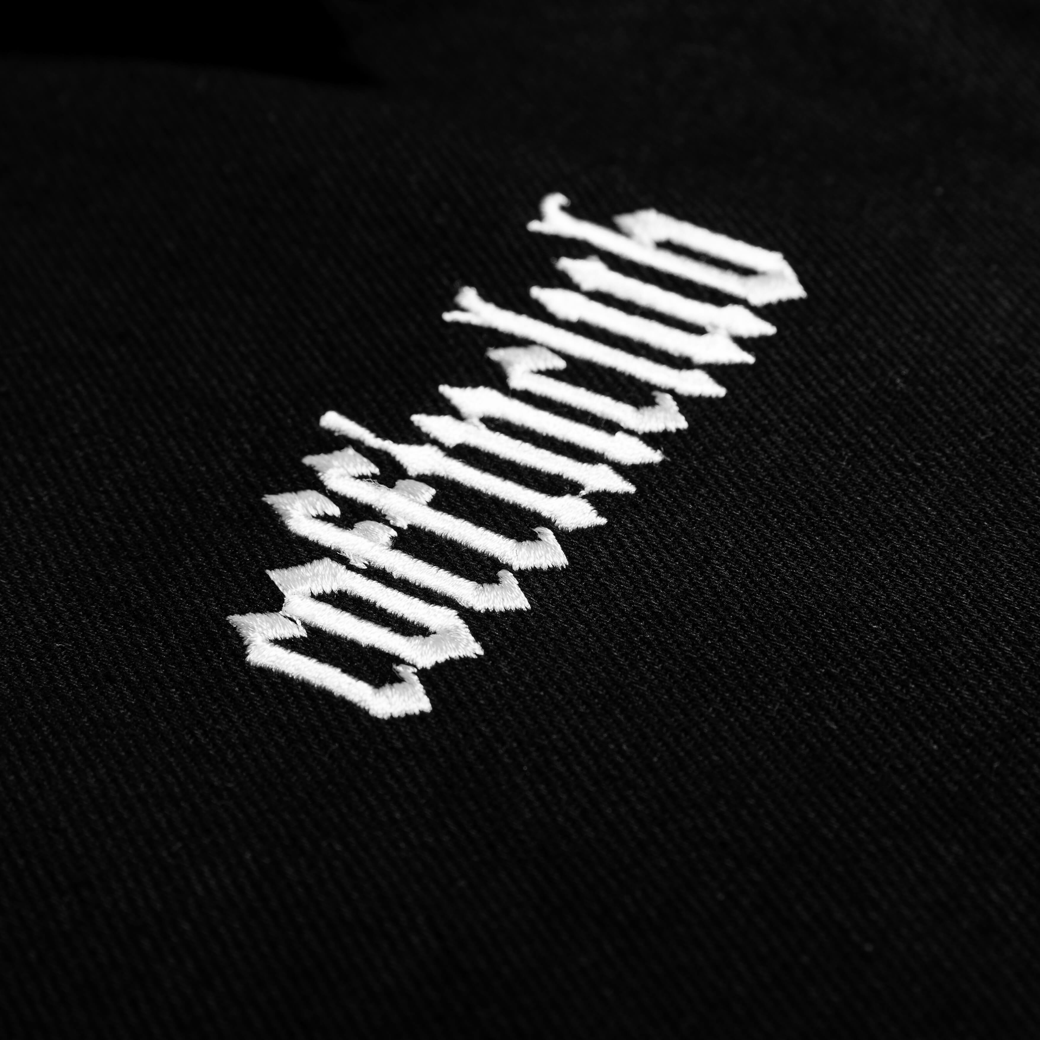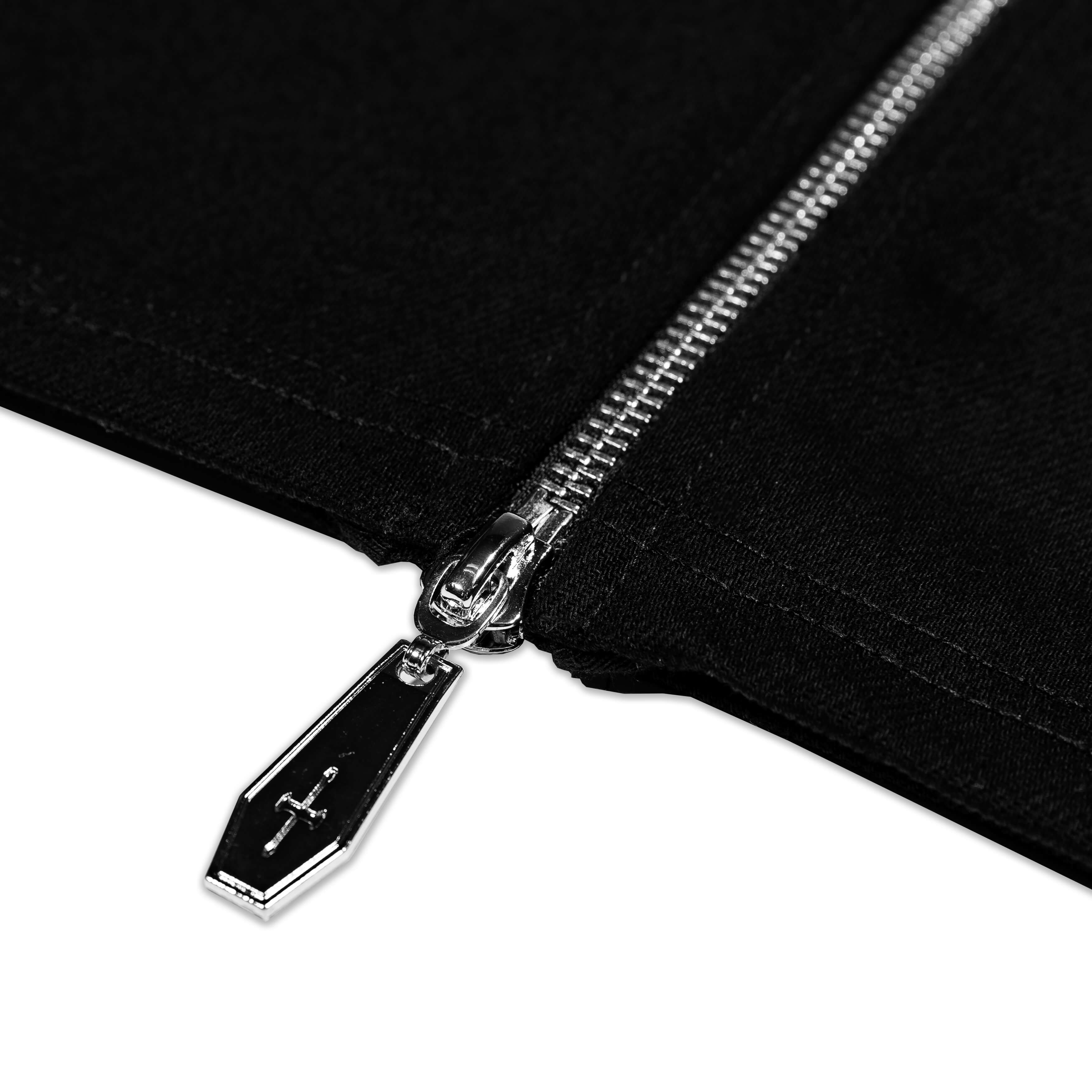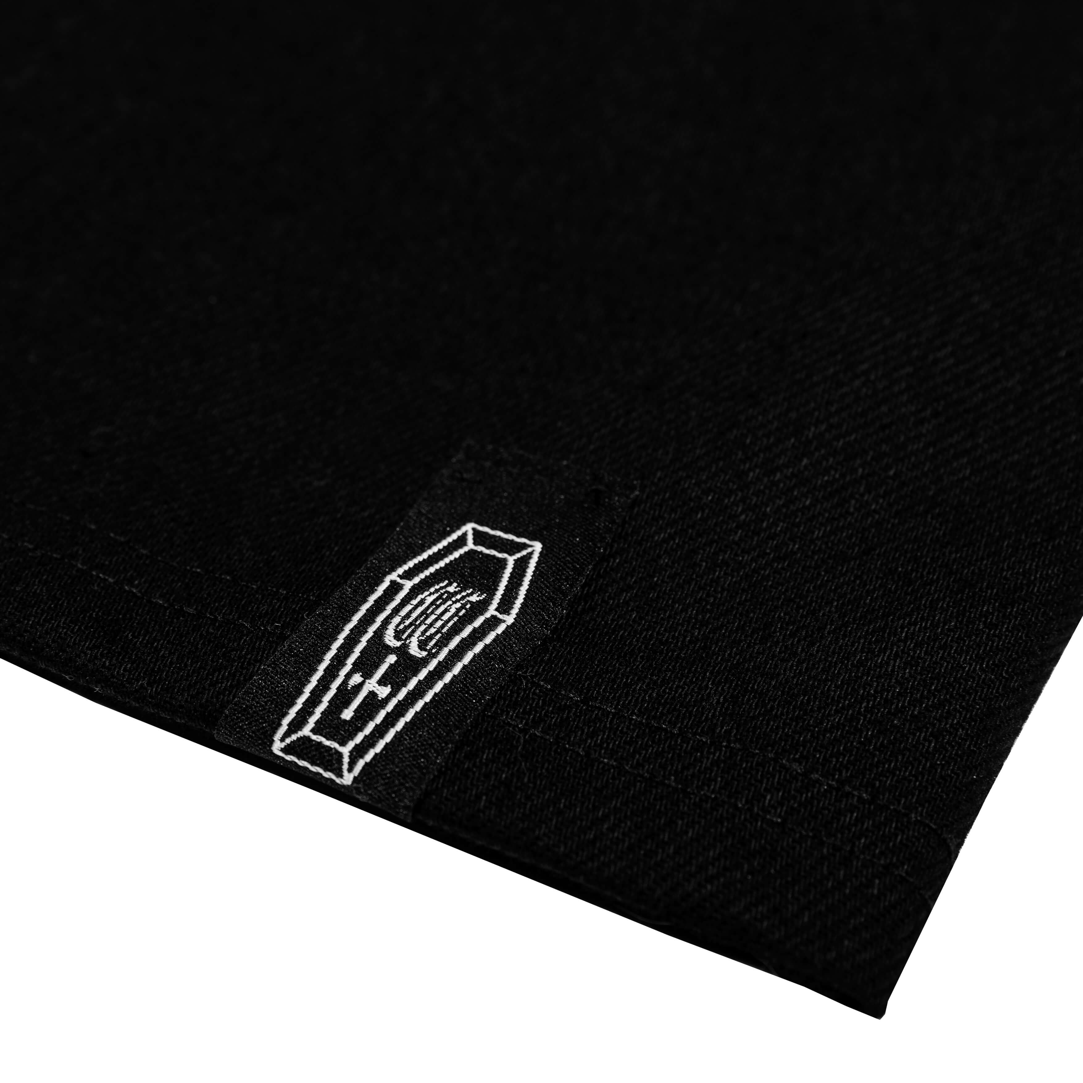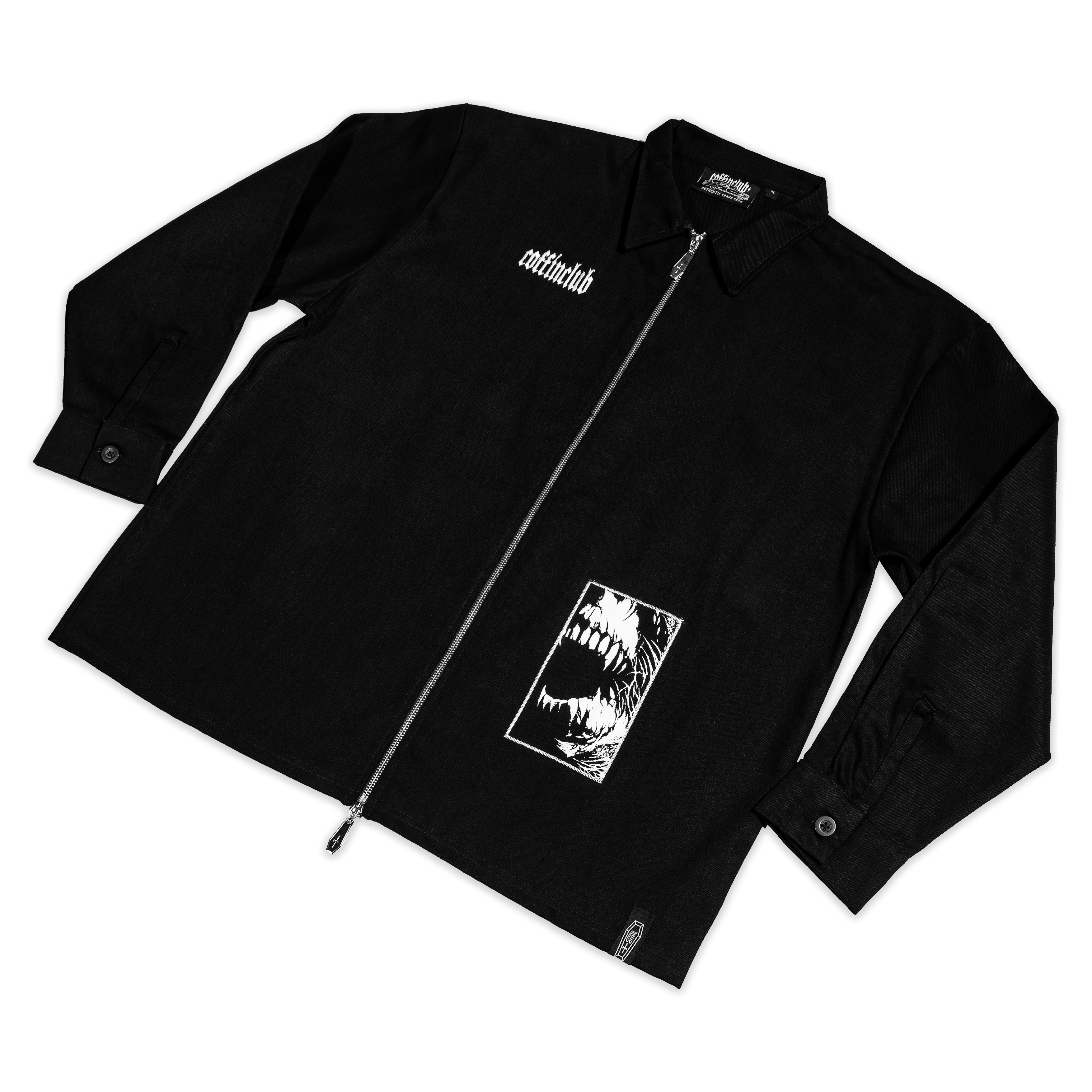 Das Death Wish Zip-Hemd aus tiefschwarzem Denim verbindet Dark-Workwear mit markanter Coffinclub-Ästhetik. Vorne trifft ein präziser Logo-Stick auf einen eindrucksvollen Undead Patch-Print mit weißem Satin-Stitch-Rahmen. Der Front-Zipper wird von einem Double-Coffin Anhänger abgeschlossen.