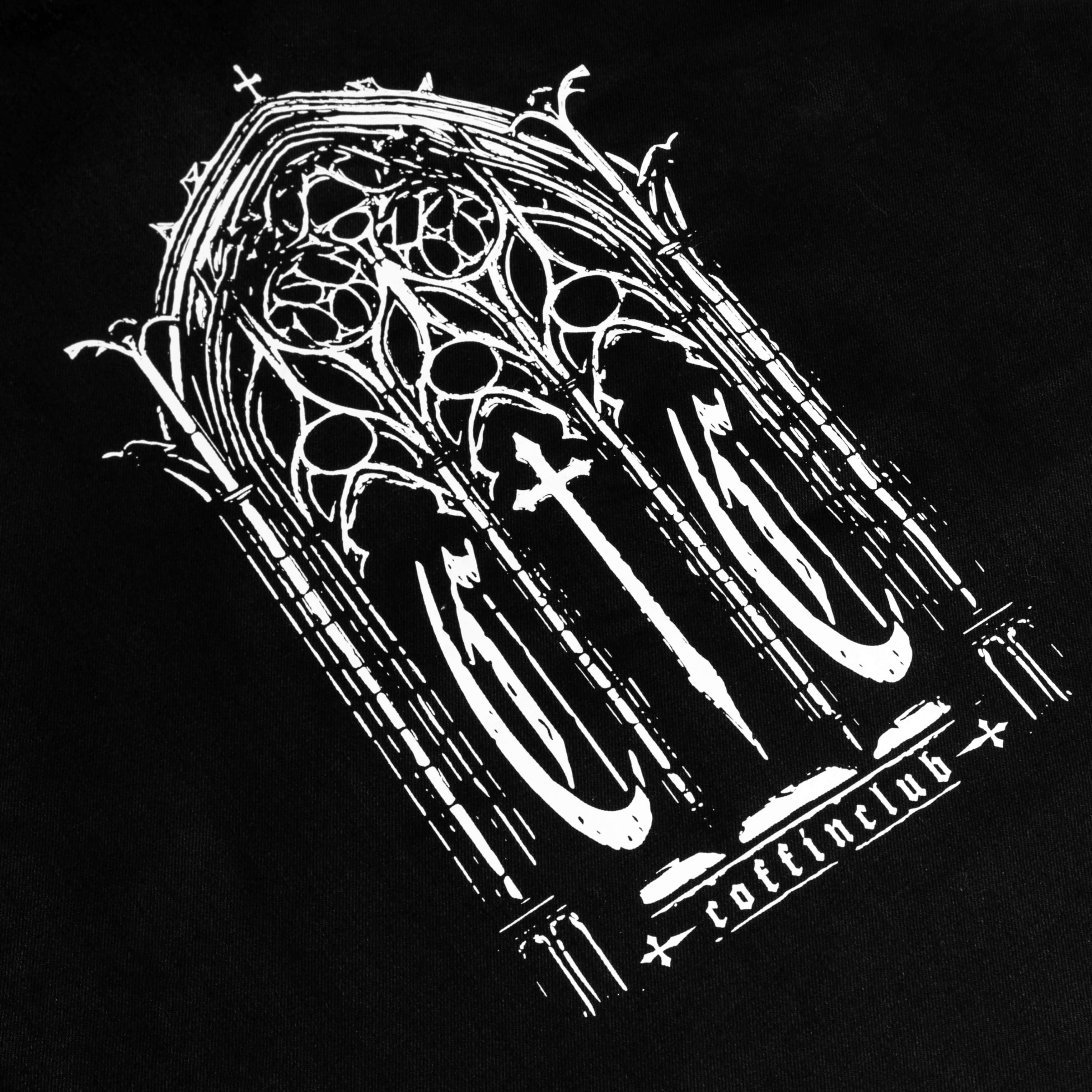 Auf dem Rücken: ein großflächiger, rauer High-Contrast Cathedral Screenprint - ein gotisches Fenstermotiv mit Kreuz, Rosetten und architektonischen Details, umgesetzt in einer distressed Monochrome-Line-Art.